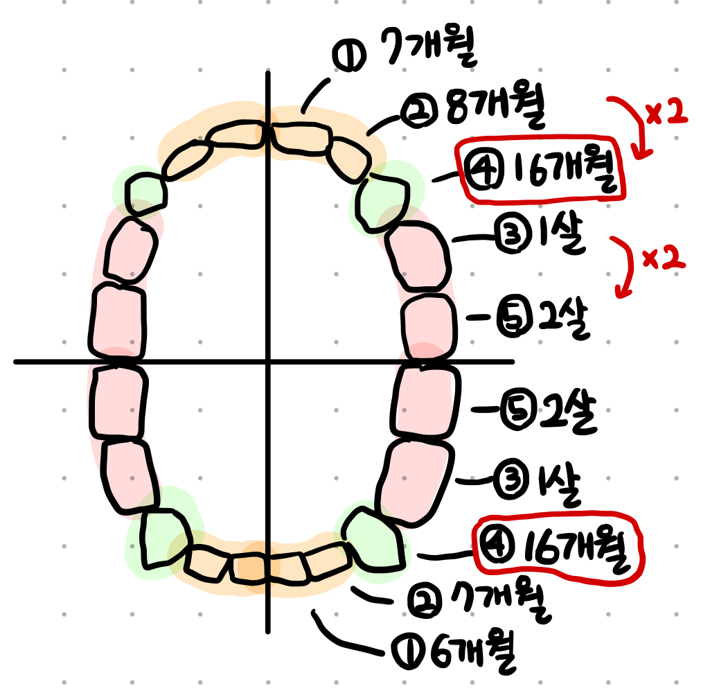 그림은 외우기 쉽게 그린 것이며 정확한 맹출시기는 표 참고하세요 :)